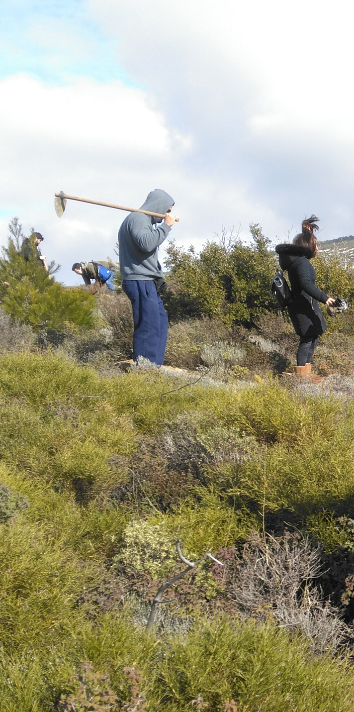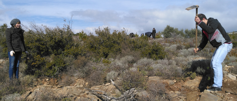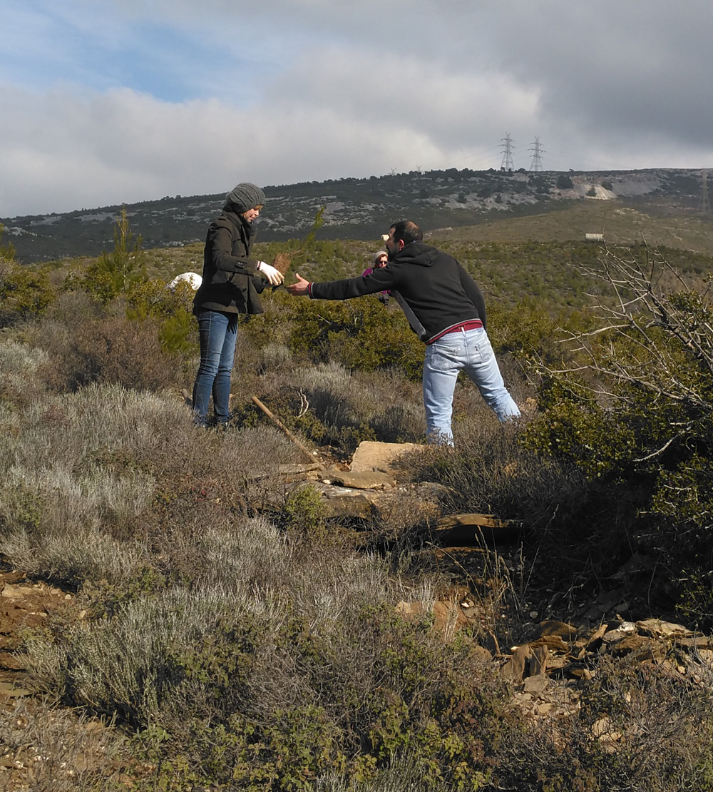 We drove to the end of Xenias street, then we took the path leading to the specific location. The SKAI people were already there, as well as the foresters and the SPAP (Association for the Protection and Rehabilitation of the burned area at Pendeli). We were welcomed with snacks and drinks and were offered the nessary planting tools, mainly the shovel that you can see below and as many baby trees as we wanted.