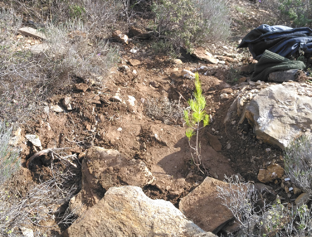 The pit should preferably be shaped as a truncated cone with the narrow surface to the depth of the pit and the wide surface at ground level. For three-year old Kefalonian firs and black pine seedlings the pit should be 40-50 cm deep and 30-40 cm wide.